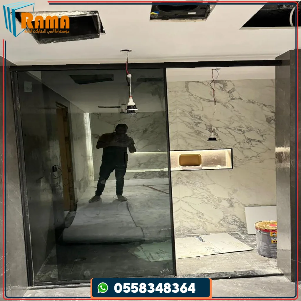 شمل المشروع تنفيذ كبائن شاور زجاجية بتصميم أنيق وحديث، باستخدام زجاج أسود (Smoked / سنكس) يمنح خصوصية عالية ولمسة جمالية فاخرة، مع اعتماد فريمات ألومنيوم سادة بتشطيب راقٍ يتناسق مع التصميم الداخلي للحمامات.